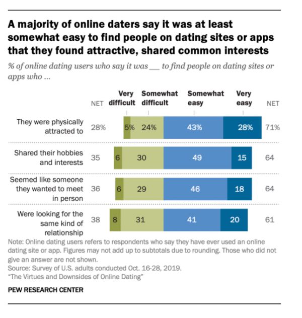 研究显示,2013年的调查与今天的调查之间存在一些差异,但是增加使用率和改善结果的总体趋势仍然是准确的。尽管存在与在线约会相关的问题,但更多的人(57%)表示有过积极的经历。但报告指出,总体而言,人们对于在线约会软件和网站如何影响美国的约会和人际关系充满矛盾。例如,一半的美国人认为这些应用程序既没有正面影响,也没有负面影响。