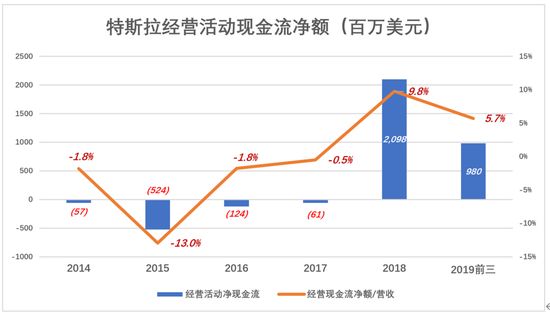 2018年,经营活动现金流由负转正,而且高达21亿美元,相当于营收的9.8%; 2019年前三季,经营活动现金流净额为9.8亿美元,相当于营收的5.7%。