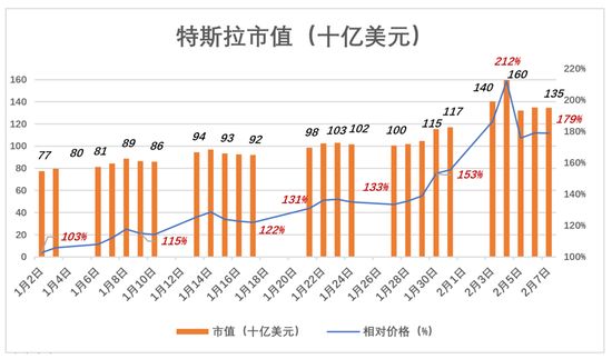 2020年刚刚过去1个多月,特斯拉股价的剧烈波动已经可以载入史册。以2019年12月31日收盘价(418.33美元)为基准,特斯拉9个交易日就涨了29%、19个交易日涨了39%、到第23个交易日(2月4日)累计上涨112%,市值达到1597亿美元;而在第24个交易日,特斯拉市值蒸发274亿美元,较2019年收盘价的涨幅收窄至76%。