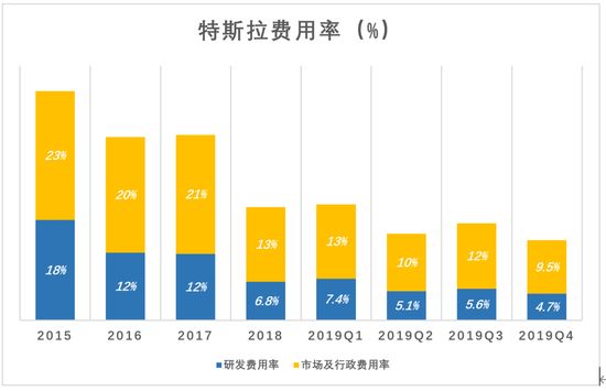 2015年,特斯拉7.18亿美元研发费用占营收的18%,9.22亿美元市场及行政费用占营收的22%,两项费用合计占营收的40%;