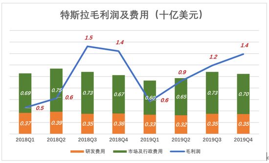 下图暗红色折线代表毛利润,彩色堆叠柱代表“研发费用”和“市场及行政费用”,可以清楚地看到特斯拉业绩拐点发生在2018年~2019年。