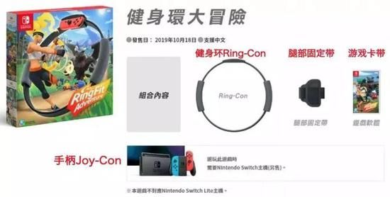 《健身环大冒险》套装设备包含游戏本体、一个Ring-Con和一个腿部固定带。