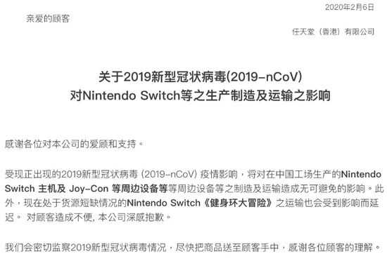 受现正出现的2019新型冠状病毒 (2019-nCoV) 疫情影响,将对在中国工场生产的Nintendo Switch 主机及 Joy-Con 等周边设备等等周边设备等之制造及运输造成无可避免的影响。