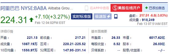新浪科技讯 北京时间11月1日晚间消息,阿里巴巴(NYSE:BABA)盘前跌逾3%,报217.51美元。