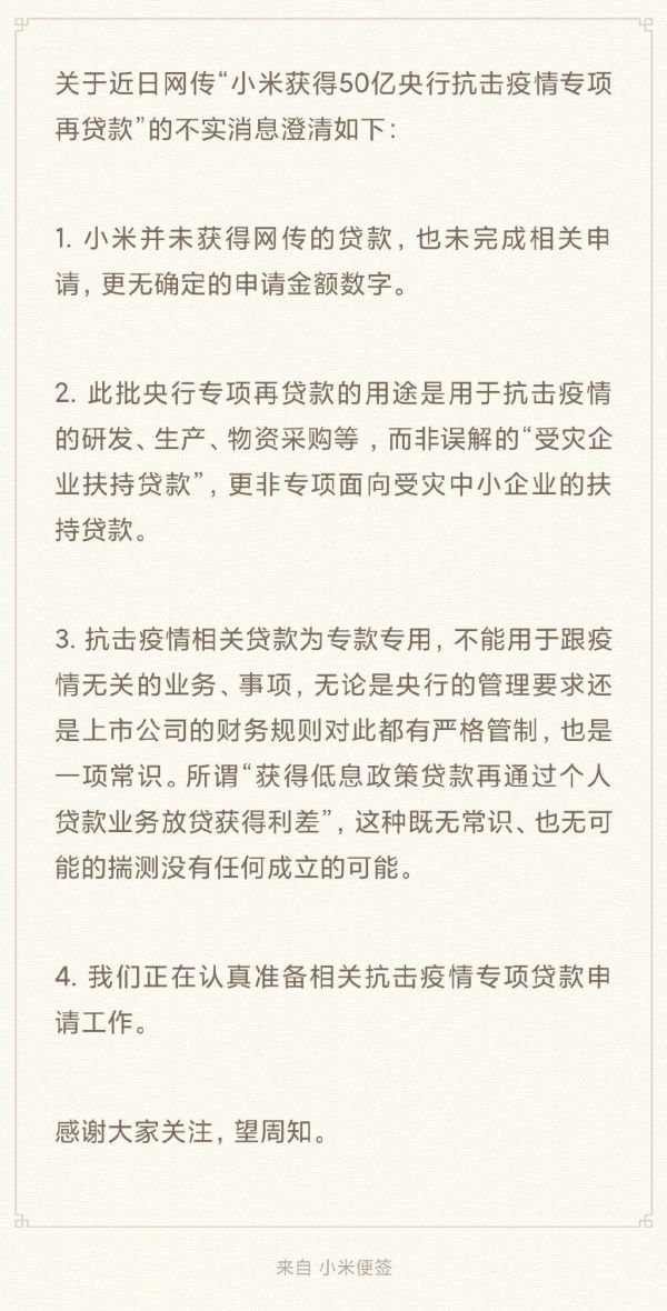 获50亿元抗疫贷款?小米:未获得,也未完成相关申请