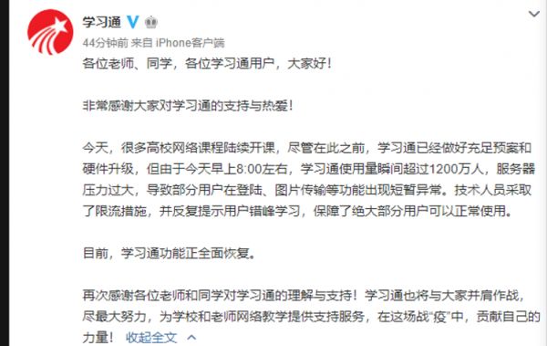 针对系统崩溃的情况,学习通官方微博公告称:今天,很多高校网络课程陆续开课,尽管在此之前,学习通已经做好充足预案和硬件升级,但由于今天早上8:00左右,学习通使用量瞬间超过1200万人,服务器压力过大,导致部分用户在登陆、图片传输等功能出现短暂异常。技术人员采取了限流措施,并反复提示用户错峰学习,保障了绝大部分用户可以正常使用。目前,学习通功能正全面恢复。
