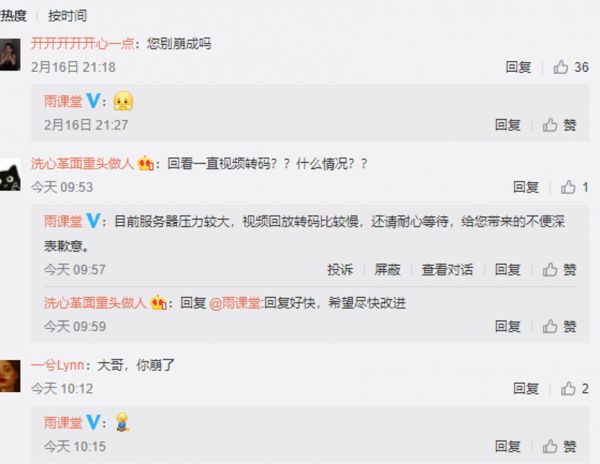 另外一家平台也扛不住巨大的流量,雨课堂在相关微博发帖之下留言表示,雨课堂目前服务器压力较大,视频回放转码比较慢,还请耐心等待,给您带来的不便深表歉意。