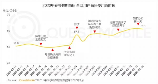 QuestMobile数据显示,受疫情影响,最长假期、最宅春节诞生,日活跃用户规模、日均用户时长均创历史新高,其中,从1月23日开始,全网用户每日使用总时长节节攀升,从原来的50亿小时,一路飙涨到57.6亿小时(1月24日,火神山直播)、61.1亿小时(2月3日,在家办公第一天),各领域时长也发生了变化,视频、游戏两大领域占比上涨至38%。