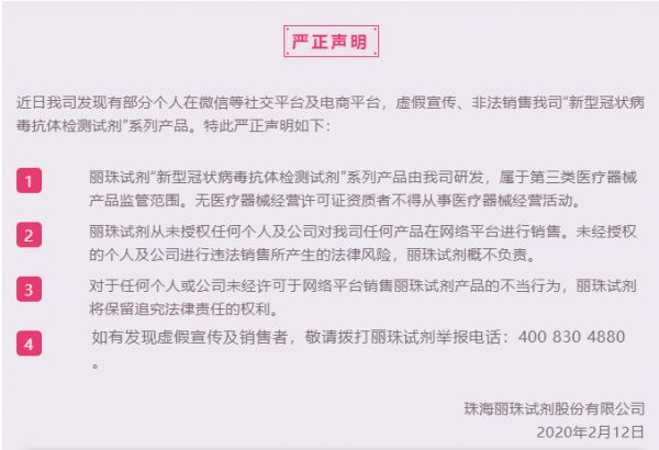 记者注意到,丽珠试剂官方公众号在2月12日曾发布《严正声明》表示,丽珠试剂“新型冠状病毒抗体检测试剂”系列产品由我司研发,属于第三类医疗器械产品监管范围。无医疗器械经营许可证资质者不得从事医疗器械经营活动。丽珠试剂从未授权任何个人及公司对我司任何产品在网络平台进行销售。未经授权的个人及公司进行违法销售所产生的法律风险,丽珠试剂概不负责。声明同时公布了举报电话。