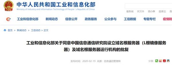 2月20日消息 我们从工业和信息化部网站获悉,工信部宣布同意中国信息通信研究院设立域名根服务器(L根镜像服务器)及成为域名根服务器运行机构,负责运行、维护和管理编号分别为JX0013L的域名根服务器。