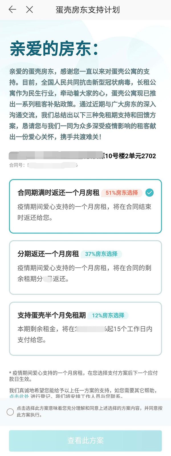 蛋壳公寓相关负责人表示,对于前期很多已经明确表示不计回报支持免租期的房东,蛋壳公寓将直接在合同期结束返还相应的租金;对于目前尚未明确表态的房东,蛋壳公寓也充分本着协商的原则,提供了三种方案,房东可以自行在蛋壳公寓APP个人中心的“蛋壳房东支持计划”页面中选择: