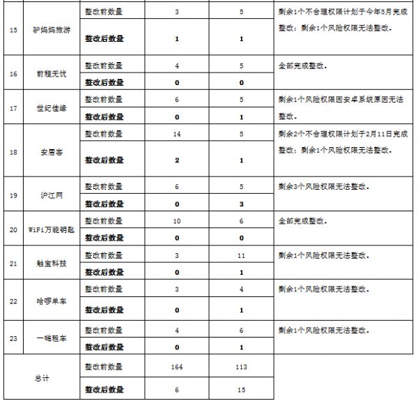 上海网信办对各App运营企业的整改工作进行督促落实,要求各企业按照整改报告切实做好整改工作。截止1月中旬,各App共整改158个“不合理权限”和98个“合理但存在风险权限”。整改后剩余6个“不合理权限”因企业战略调整等原因还未整改,但都已列出详细整改计划,剩余15个“合理但存在风险权限”因安卓系统的限制,无法完成“修改为一次性授权”的整改,但会对此类权限加强网络安全管控,严防个人信息泄露风险。各App整改前、整改后的权限数量和未整改权限的整改计划等情况详见下表。
