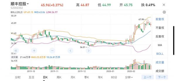 截至2月24日收盘,顺丰控股收涨0.37%,股价为45.96元,市值为2028.94亿。值得一提的是,在过去的一个月里(1月23日-2月24日)顺丰股价涨幅已近20%。