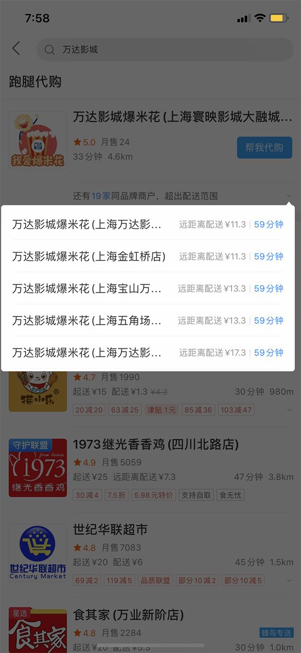 2月25日,澎湃新闻(www.thepaper.cn)记者查阅饿了么平台发现,目前已经能通过跑腿代购19家上海地区影城的商品。这些商品中包括爆米花、饮品、零食以及电影衍生品等。