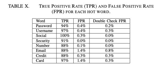 其中在语音识别方面,研究者采用了一个名为 ”热词搜索“ 的识别模型——用四名志愿者(两男两女)的 200 个短句(其中每个句子包括一到三个信息敏感词汇,比如说密码、用户名、社交信息、安全信息、数字、邮箱地址、卡号等)来测试,发现这一模型的识别率高达 90%。
