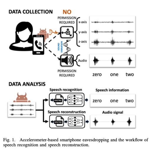 具体来说,这种语音信号所引起的震动,将会被加速度传感器接收并产生读数——这种因为震动而产生的读数可以被攻击者通过深度学习算法进行分析,可以解读出其中的关键信息,甚至可以还原成扬声器所播放的声音信号。