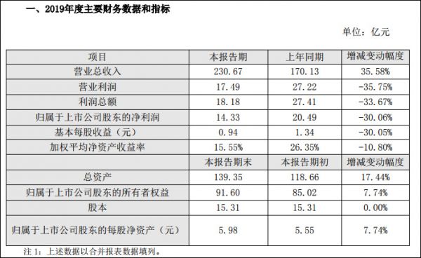 根据公告,申通快递2019年实现营收230.67亿元,同比增长35.58%;但营业利润为17.49亿元,同比下降35.75%;利润总额18.18亿元,同比下降33.67%;归母净利润14.33亿元,同比下降30.06%。