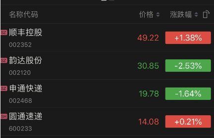 上述业绩发布后,今天A股开盘,圆通、韵达、申通股价均走低,顺丰微涨。截至午间休盘,顺丰涨幅为1.38%,圆通微涨0.21%,韵达跌幅为2.53%,申通跌1.64%。