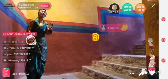 “我们这个墙有点厚,一会儿网不好请大家见谅。”她边走边喘着,还专业地为网友介绍起了布达拉宫的建筑、文物和历史,以及西藏的文化。