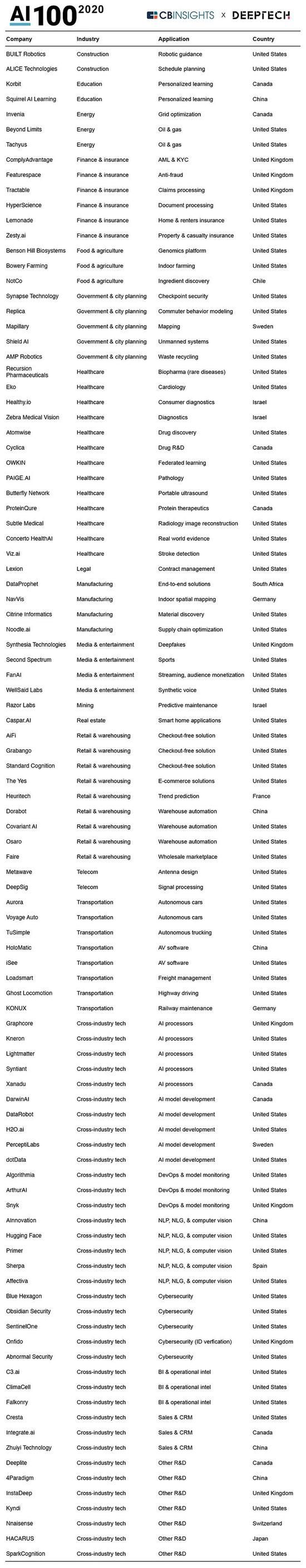 以下为 2020 年 AI 100 榜单完整名单(归属国家按照总部所在地划分,排名按归属行业排列):