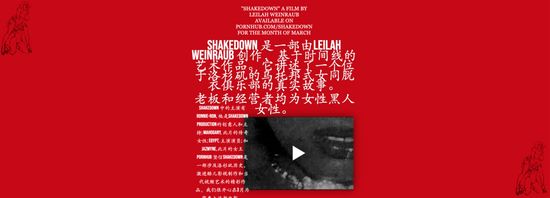 这一次,为避免尴尬,区分日常内容,Pornhub为《Shakedown》开设了专属网页,以此设立起一个画风完全不同的独立空间:红白黑三色,严肃的字体,醒目的字号,一丝不苟的线条和留白分割鲜明……这部电影将在这里免费放映整个三月,导演LeilahWeinraub还将每周上线一次网页中的聊天区,和用户进行交流。