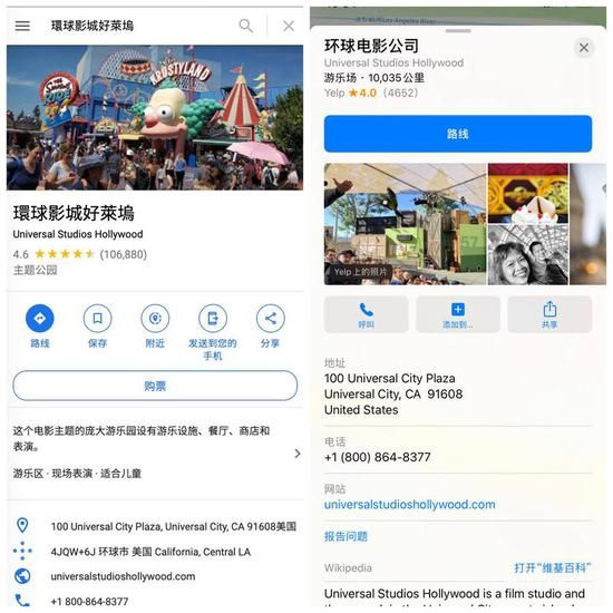 举例来说,洛杉矶环球影城这个景区,Google 地图(左)积累了 10 万条以上的评论,而苹果地图(右)的评论来自 Yelp,仅有 4000 多条。
