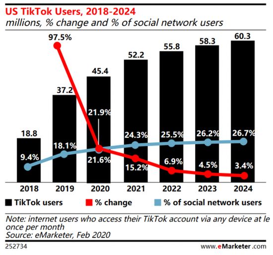 另据eMarketer报告显示,TikTok美国用户群在2019年增长了97.5%;2020年将增长21.9%,达到4540万人;该数字在2021年将超过5000万。TikTok吸引了大量用户,尤其是儿童和青少年。但eMarketer预测称,随着这款应用在核心年轻用户中变得严重饱和,TikTok增长率到2022年将放缓至个位数。