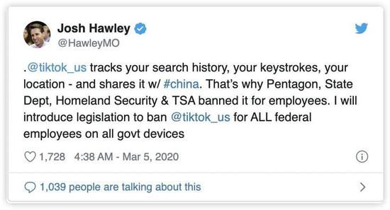 听证会伊始,乔希·霍利即表示将推动制定立法,禁止所有联邦政府雇员在所有联邦政府设备上使用TikTok。他称TikTok会收集用户访问记录,搜索历史,点击记录,以及邮件、图片、位置资料。
