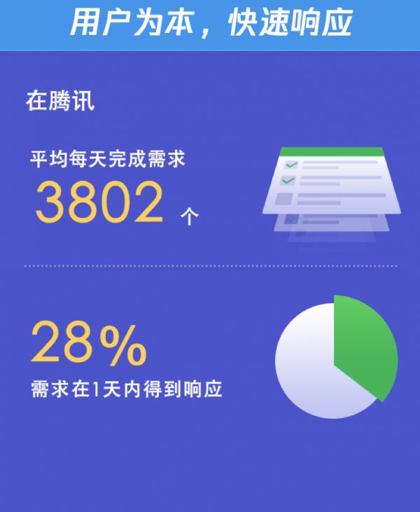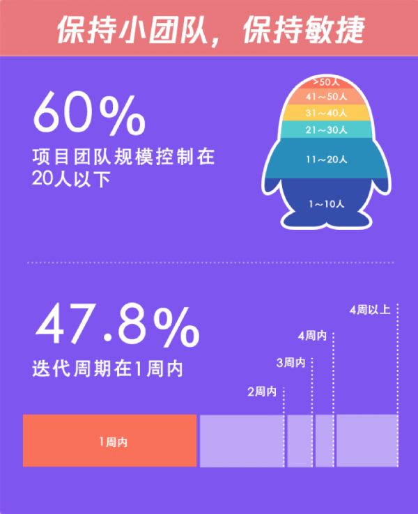 数据显示,腾讯60%的项目团队规模在20人以下,47.8%的项目迭代周期在1周之内,平均每天完成用户需求3802个,而28%的需求可以在1天内得到响应。另外在Bug处理方面,46%的Bug在1天内得到解决,82%的Bug在1周内得到解决。