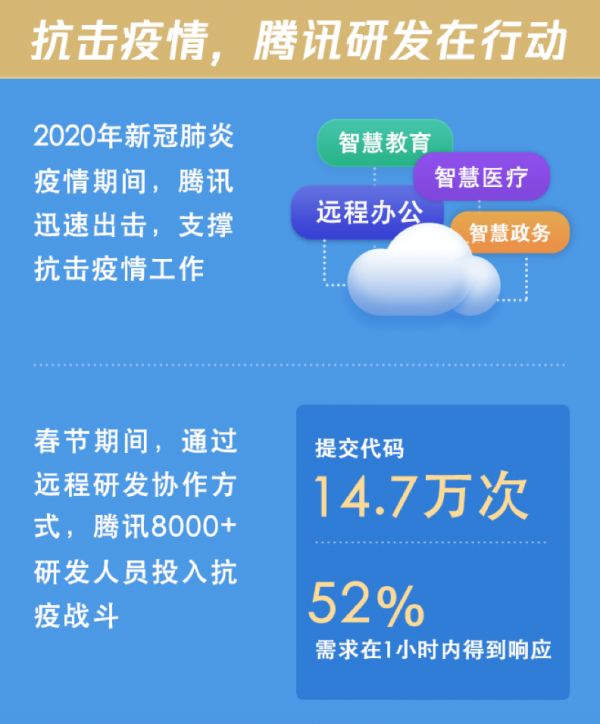 报告显示,在2020年新冠肺炎疫情期间,腾讯在智慧教育、智慧医疗、远程办公、智慧政务等各个领域推出相应服务,腾讯会议、企业微信、TAPD、腾讯工蜂、腾讯乐享等多款ToB产品全面升级功能、免费开放,支撑抗击新冠肺炎疫情工作。春节期间,腾讯有8000多名研发人员通过远程研发协作方式投入抗疫战斗,共提交代码14.7万次,52%的需求在1小时内就能得到响应。