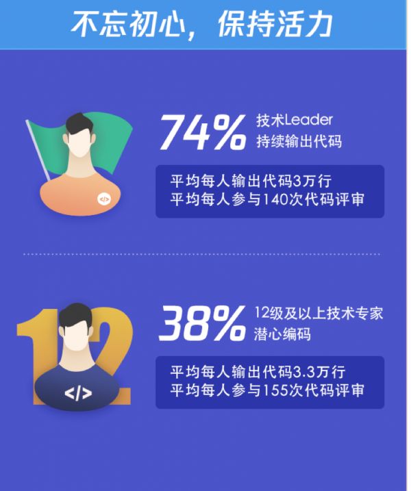 在技术管理人员的研发参与度上,腾讯保持着强大的活力。腾讯74%的技术Leader仍在持续输出代码,2019年全年,平均每人输出代码3万行,参与140次代码评审;38%的12级及以上技术专家潜心编码,平均每人输出代码3.3万行,参与155次代码评审。