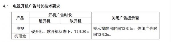 《意见》指出,硬开机、软开机状态下,开机广告时长均不得超过30秒,关闭广告提示窗应在广告播放后1秒内显示;关闭广告时间不得超过3秒。