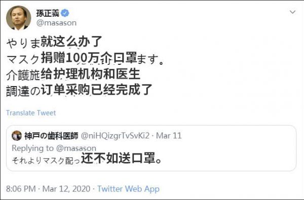 北京时间12日晚,经历“捐赠100万份检测试剂被网友骂到放弃”的日本软银集团董事长兼总裁孙正义,在推特转发了一位“幸运网友”的提议,决定捐赠100万只口罩给医护机构。