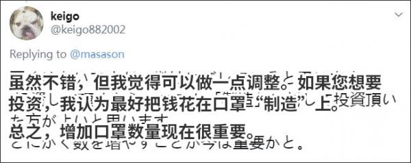 而更多的日本网友,则在孙正义推文下质疑其从海外订购口罩的做法,认为与其从外面买,不如投资日本国内的生产线。