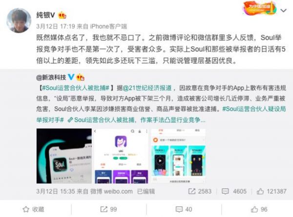 一罐创始人郭子威发微博称:“实际上Soul和那些被举报者的日活有5倍以上的差距,领先如此之多还玩下三滥,只能说管理层基因优良。”