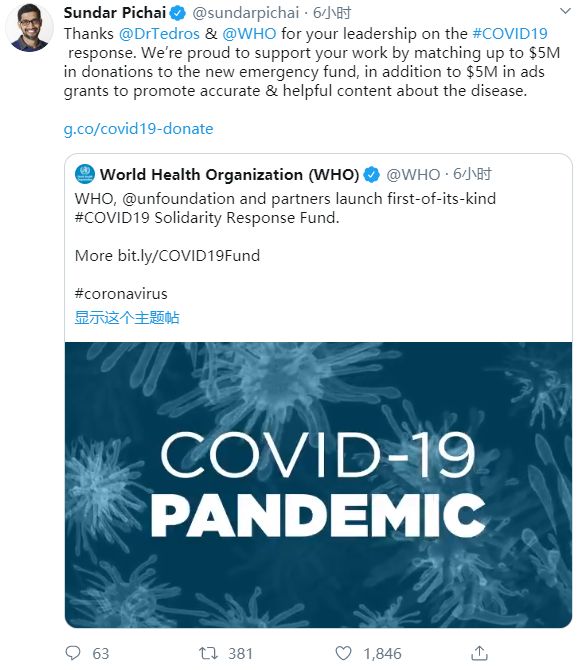 Alphabet和Google的首席执行官桑达尔·皮查伊(Sundar Pichai)此前也表示,Google.org将向同一全球应急基金提供多达500万美元的捐款。皮查伊周五在推特上宣布了这一消息。