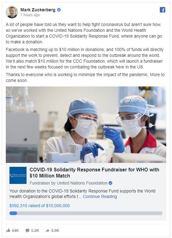 Facebook用户在一天之内为COVID-19团结响应基金筹集了超过59万美元,正朝着实现1000万美元的目标迈进。COVID-19是由新冠病毒引起的呼吸系统疾病。根据Facebook的帖子,100%的资金将用于全球的预防、检测和应对工作。