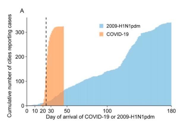 值得注意的是,COVID-19从武汉往外扩散的速度很快。共有262个城市在28天内报告了病例。作者们提到,相比之下,2009年甲型H1NI流感大流行传播到相同数量的城市花了132天。1月23日,也就是武汉实施出行禁令的当天,首次报告COVID-19的城市数量达到了59个的峰值。