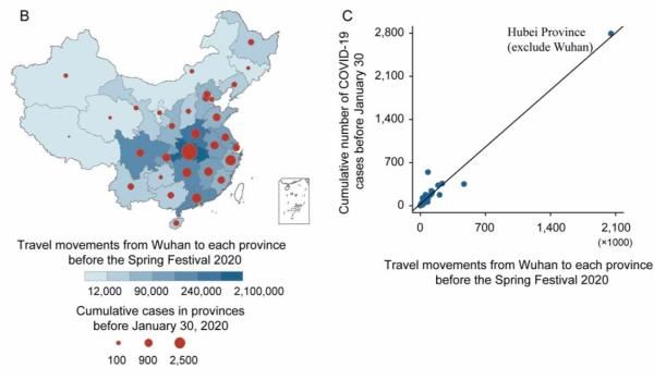 到1月30日,即武汉封城一周后,各省报告的病例总数与来自武汉的旅客总数密切相关。人口越多以及来自武汉的人员较多的城市,COVID-19较早暴发。