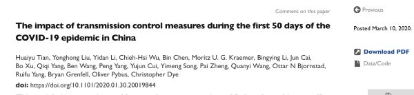 作者们认为,这份早期分析表明,在中国春节假期期间启动的传播控制(非药物)措施,包括前所未有的武汉出行禁令和一级应急响应,推迟了中国境内COVID-19疫情的增长,并限制了其规模。
