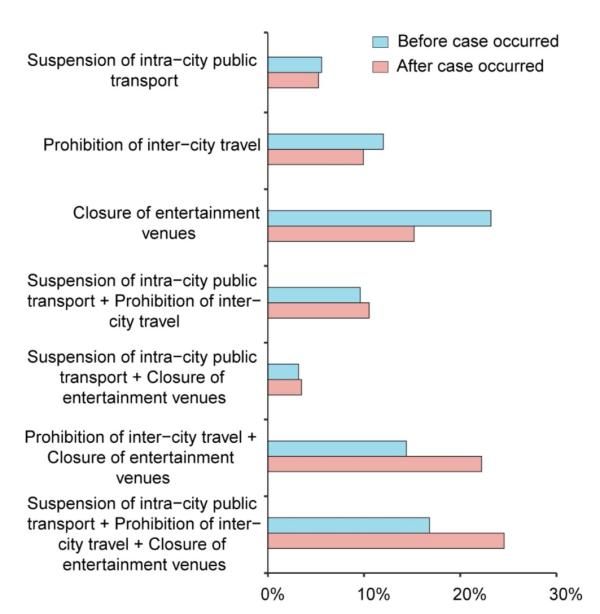在第一例病例报告之前(蓝色)、当天或之后(红色)实施三种传播控制措施的城市的百分比。