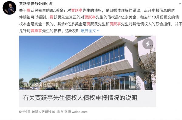 贾跃亭债务处理小组表示,“关于贾跃民的8亿美金针对贾跃亭先生的债权,这是自媒体理解的错误,可能是由于列表的归类不清晰造成的。如果点开申报信息的附件明细可以看到,贾跃民先生真正的对贾跃亭先生的债权是1亿多美金,和去年10月份提交的债权本金是完全一致的,其余的6亿多美金只是贾跃民先生和贾跃亭先生对其他债权人的联合担保,并不是针对贾跃亭先生的债权,接下来会重新更准确地列示。所以这6亿多美金部分既不会从信托额度里分得偿债额度,也不会在投票中产生任何影响。”