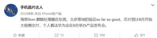 今日,业内人士@手机晶片达人 透露称,海思5nm麒麟处理器在东莞、北京等地的验证情况良好,预计8月开始大规模交付。