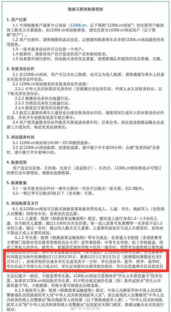 人民日报客户端3月15日消息,3月14日,中国铁路12306网站更新《铁路互联网购票须知》显示,疫情期间,学生票寒假的乘车时间已由12月1日至3月31日延长至5月31日。