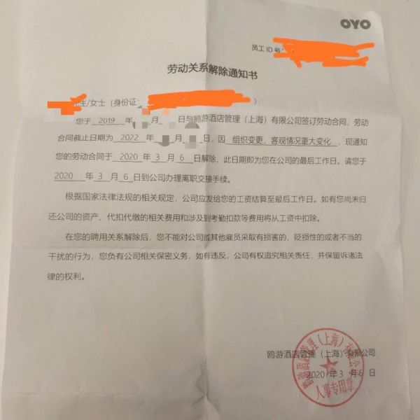 “上午还在正常工作,就发了《劳动关系解除通知书》。”李锋称,3月初OYO酒店跟其协议解除劳动关系,并口头表达按0.5至1个月的基本工资赔偿,他不同意,3月11日就拿到了被单方面解除劳动关系的“正式通知”,并且没有拿到任何赔偿。