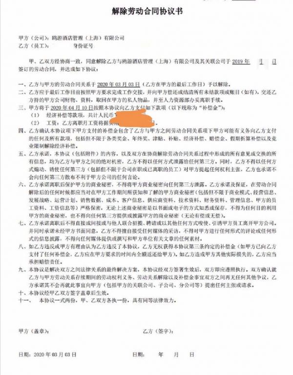 澎湃新闻获得的一份落款为鸥游酒店管理(上海)有限公司的《劳动关系解除通知书》显示,解除劳动关系的原因是“组织变更,客观情况重大变化”,原本应为期3年的劳动合同提前于3月6日解除,提前了两年半多,员工被要求当日办理离职交接手续。