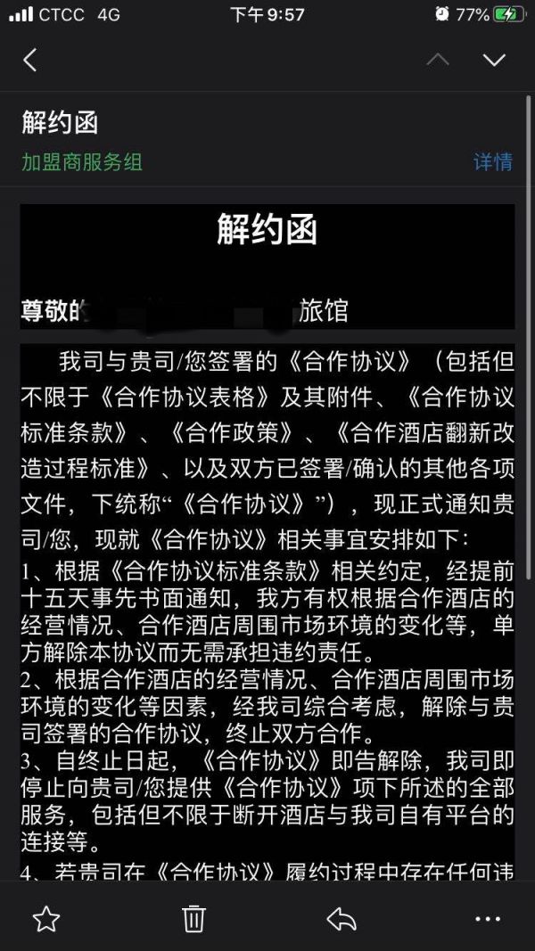 根据澎湃新闻获得的一份OYO酒店加盟商服务组通过邮件发给某旅馆的《解约函》,显示“根据合作酒店的经营情况、合作酒店周围市场环境的变化等因素”,OYO酒店方面解除与酒店的合作协议,并自终止之日起停止向酒店提供合作协议项下所述的全部服务,包括但不限于断开酒店与公司自有平台的链接等。