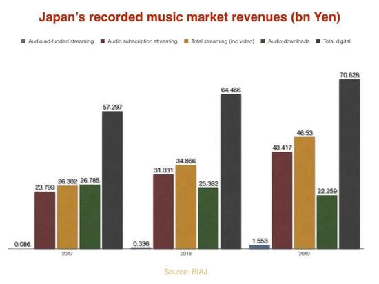 根据日本唱片业协会RIAJ近期发布的数据显示,2019年,以Spotify为代表的付费订阅和广告支撑的流媒体服务在日本创造了419.7亿日元(3.85亿美元)的收入,比2018年的313.7亿日元增长了33.8%,相比2017年的238.9亿日元几乎翻番。