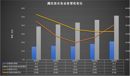 在第四季度,受益于音乐订阅收入的强劲增长,腾讯音乐来自于在线音乐服务的营收大涨40.7%,达到人民币21.4亿元。而在2019年前三个季度,这一数据的同比增幅分别为28.0%、20.2%、26.2%。
