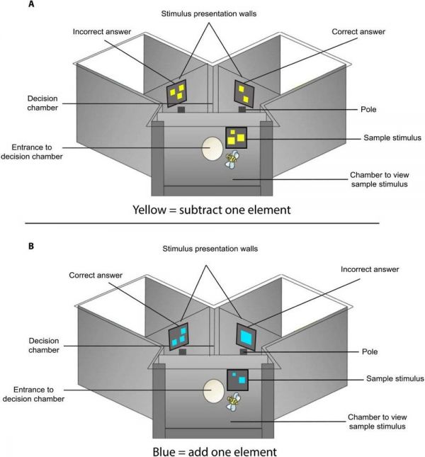 答案是,可以的。最近,澳大利亚墨尔本皇家理工大学( RMIT University in Melbourne)的研究人员进行了一项研究,他们给蜜蜂设置了一套Y形的装置。一开始,蜜蜂待在起点“读题”,题板上有1个~5个带色的形状,它们的总和代表一个数字。如果形状是蓝色,那么蜜蜂就要到分叉口+1,然后选出正确答案指示的通道;如果是黄色,那么就要到分叉口-1,然后选出正确答案指示的通道。答对了(Correct answer),就有糖水奖励一下;答错了(Incorrect answer),就只有稀释过的奎宁溶液喝[4]。